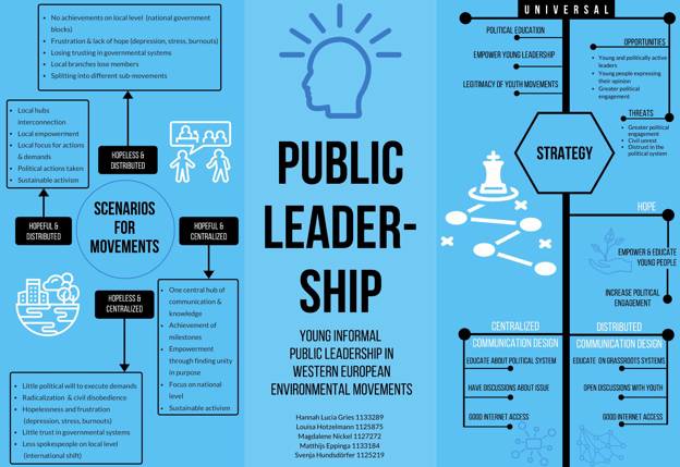 - Rechterkant: Strategieën voor public leadership met een focus op politieke educatie, jongerenleiderschap en legitimiteit van jeugdbewegingen. Twee communicatiestrategieën worden vergeleken: een gecentraliseerde en een gedistribueerde aanpak. Onderwerpen zoals kansen, bedreigingen, hoop en politieke betrokkenheid worden besproken.