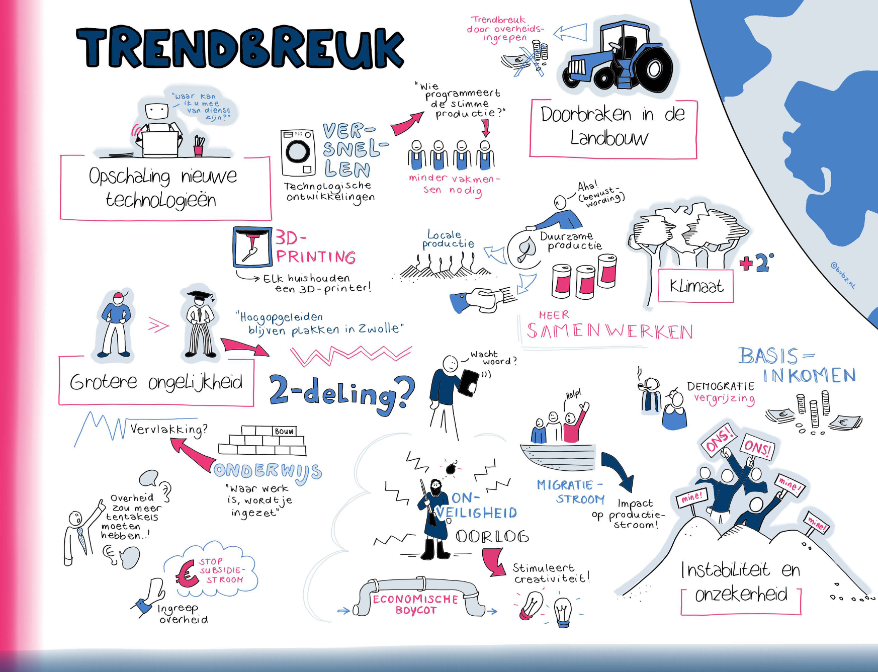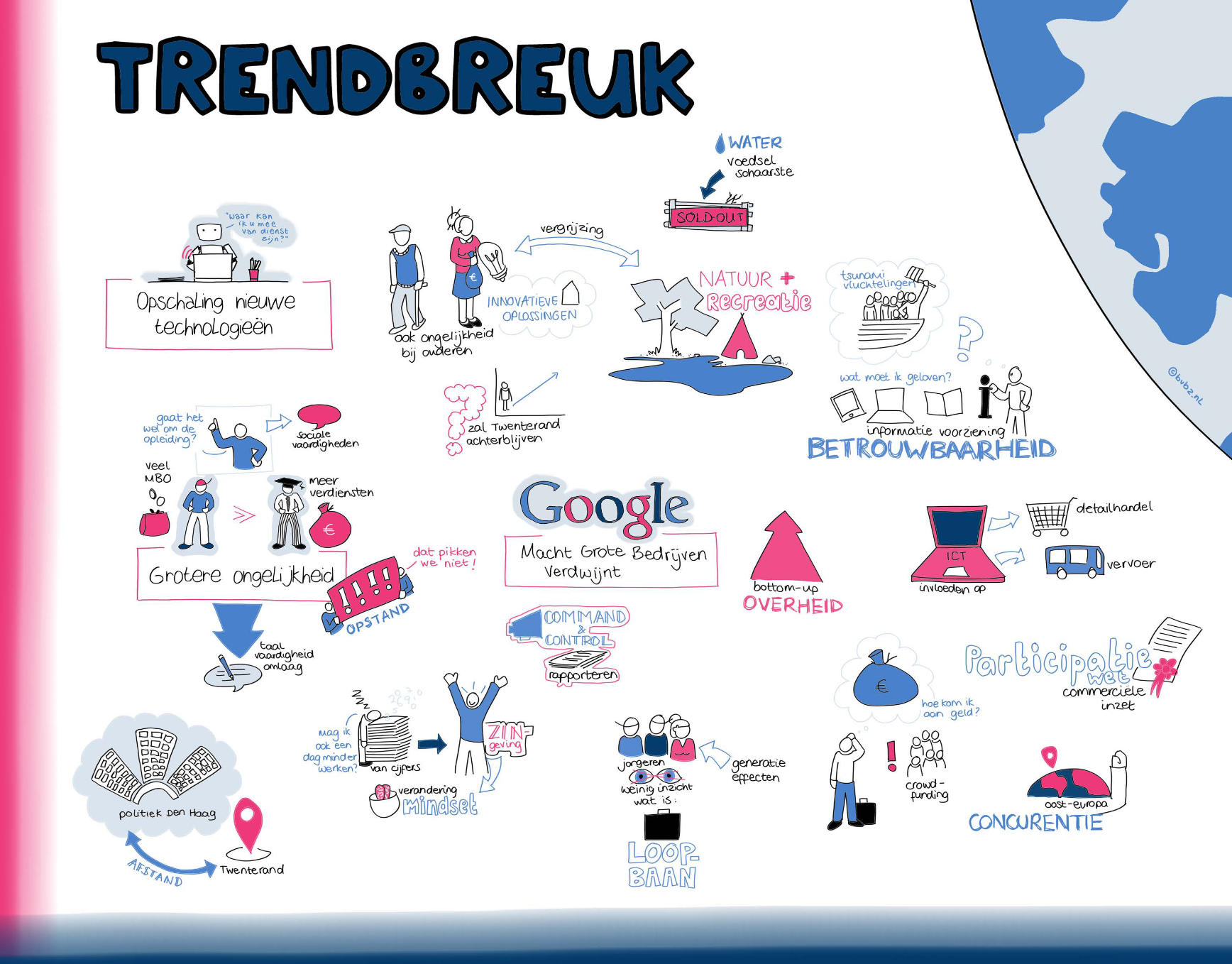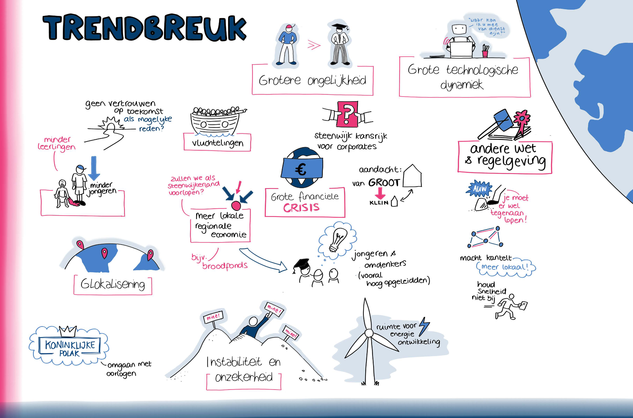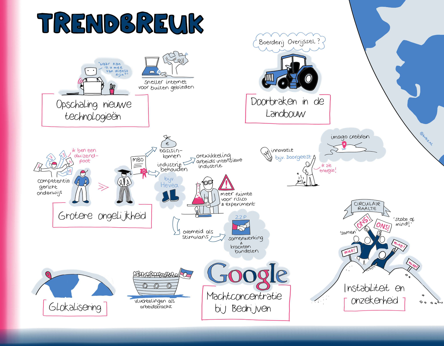 De toekomstverkenning ‘Waar verdient Overijssel zijn geld mee in 2030?’ werd op een bijzondere manier in bespreking gebracht. In alle 25 gemeenten werd gesproken met 8 personen. In al die 25 gemeenten gaat het daarbij om een lid van het college van burgemeester en wethouders, een raadslid, een starter, iemand vanuit een vrijwilligersorganisatie, een directeur van een onderwijsinstelling, een directeur van een bedrijf in de maakindustrie, iemand uit de creatieve sector en iemand uit de arbeidsbemiddeling. Op die manier kreeg het Trendbureau Overijssel vanuit verschillende perspectieven ideeën over de toekomst van de economie in de 25 gemeenten en ontstonden tegelijkertijd ook algemene lijnen voor Overijssel als geheel. Van de gesprekken met 19 gemeenten zijn trends voor de toekomst in beeld gebracht en hieronder te downloaden.